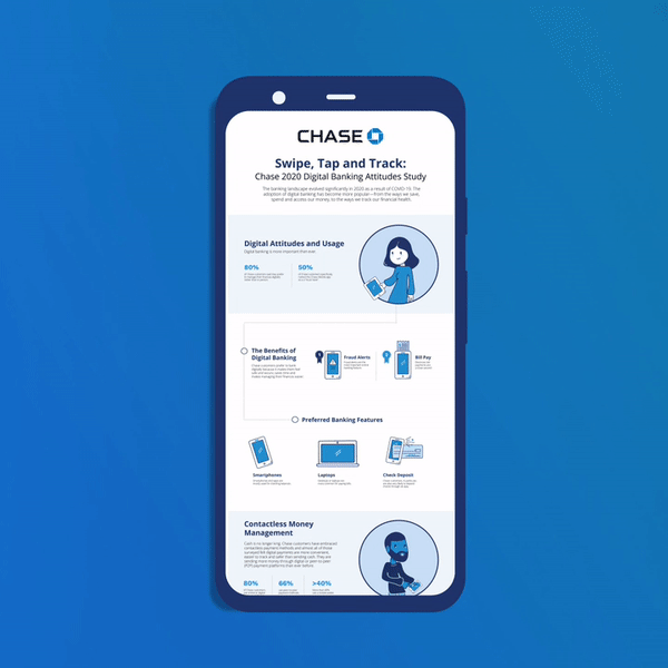 I designed a seamless, adaptable infographic to illustrate a survey on shifting banking attitudes, aligning with Chase’s brand guidelines. Using custom iconography and engaging illustrations, the infographic effectively communicated complex data in a visually compelling format, serving as both an internal educational tool and a flexible asset for press releases and social media.