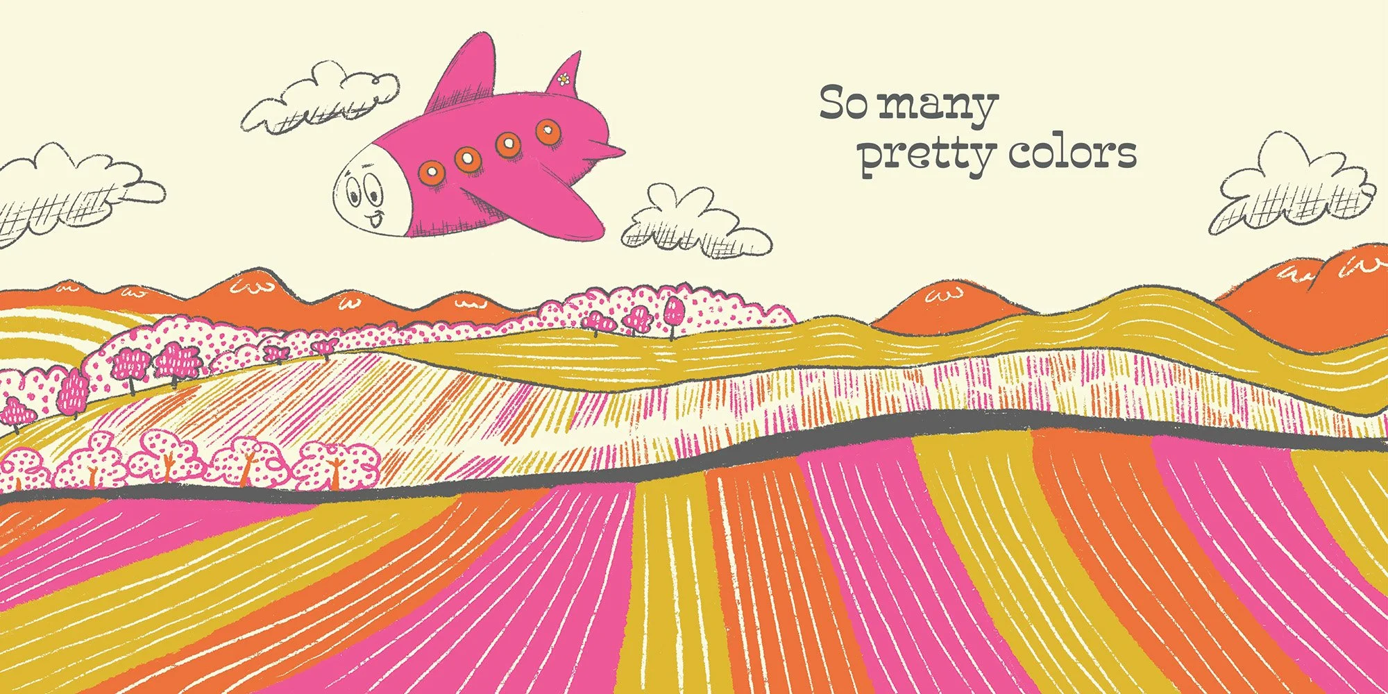 An illustrated children’s book exploring color, curiosity and imagination through whimsical landscapes and hand-drawn textures. The work blends bold retro palettes with soft, narrative-driven scenes that invite readers to slow down, look closely, and find joy in visual exploration.